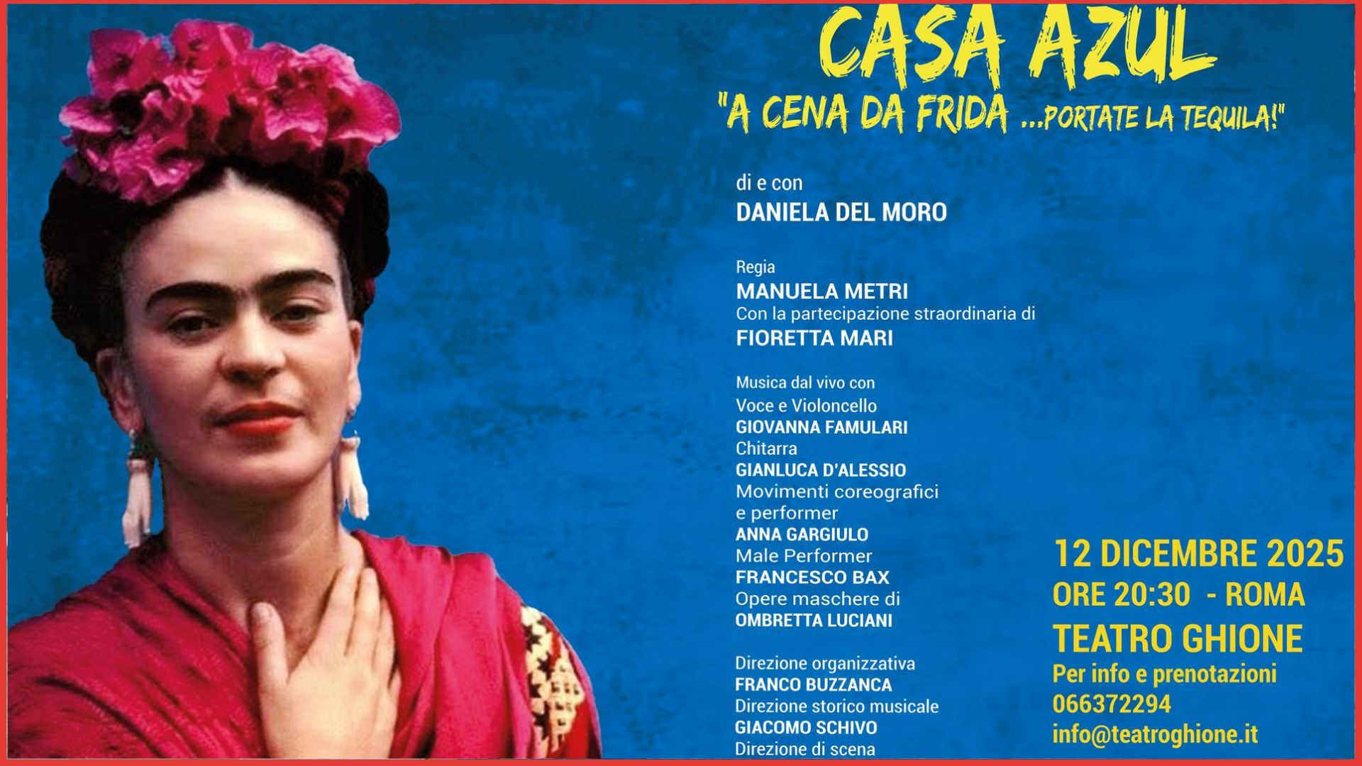 ROMA – Venerdì 12 dicembre alle ore 20:30, il Teatro Ghione di Roma apre le sue porte a Casa Azul – A cena da Frida… portate la tequila!, uno spettacolo originale di e con Daniela Del Moro, per la regia di Manuela Metri, con la partecipazione straordinaria di Fioretta Mari, musica dal vivo, performance coreografiche e un allestimento visivo che fonde teatro, arte e narrazione. Una produzione STArt, che invita il pubblico a sedersi idealmente alla tavola della pittrice messicana più iconica del Novecento per celebrare con lei una notte di festa, memorie e rivelazioni. L’idea nasce da un’immagine potente: una cena a Casa Azul, la celebre dimora di Frida Kahlo a Coyoacán, oggi museo e simbolo di una vita vissuta nell’eccesso della passione, dell’arte e del dolore. La serata è quella in cui Frida si prepara a risposare Diego Rivera, in un secondo matrimonio che sa di follia, ostinazione e riscatto. In questa cornice, reale ma sospesa tra ricordo e immaginazione, prende forma una rappresentazione che mescola i piani del racconto biografico, della riflessione intima e del gioco teatrale.