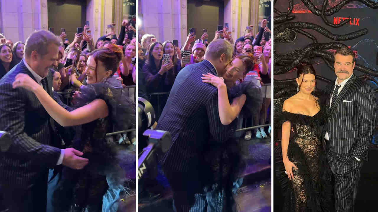 Netflix ha condiviso un video dell’arrivo dei due attori con la didascalia “David Harbour e Millie Bobby Brown arrivano insieme per l’ultima premiere di Stranger Things”, immortalando l’abbraccio pubblico tra i protagonisti che interpretano rispettivamente Jim Hopper ed Eleven, personaggi legati nella serie da un profondo rapporto padre-figlia adottiva.